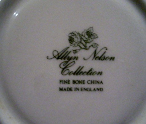 This cup from the Allyn Nelson Collection is bone china and made in England.